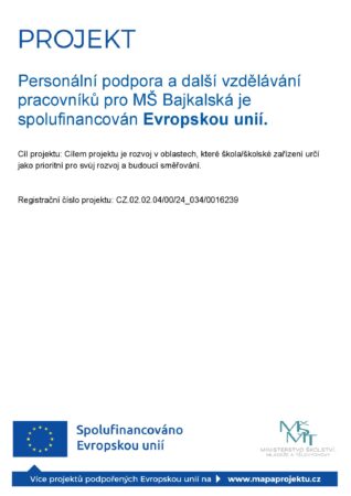 – 22. 4. 2025 – proběhne fyzický zápis na prázdninový provoz v MŠ, kterou si zákonný zástupce zvolil na prázdninový provoz; pro MŠ Bajkalská 22. 4. 2025 od 13 do 17 hodin. V ten den zákonný zástupce v MŠ, která zajišťuje náhradní prázdninový provoz, odevzdá vyplněnou Žádost o přijetí společně s kopií Evidenčního listu dítěte, kterou obdrží ve své kmenové MŠ, popř. doporučení PPP/SPC.